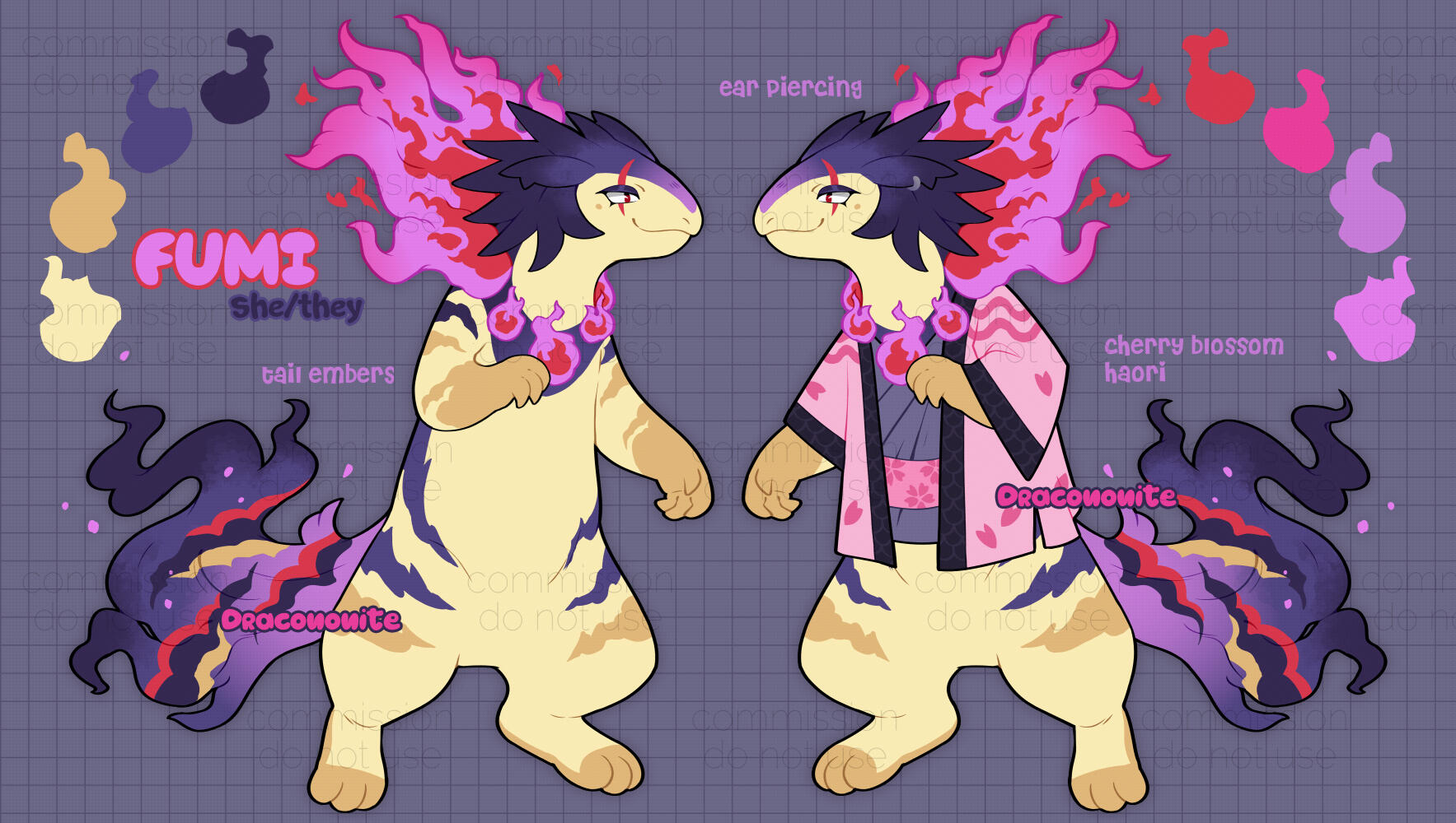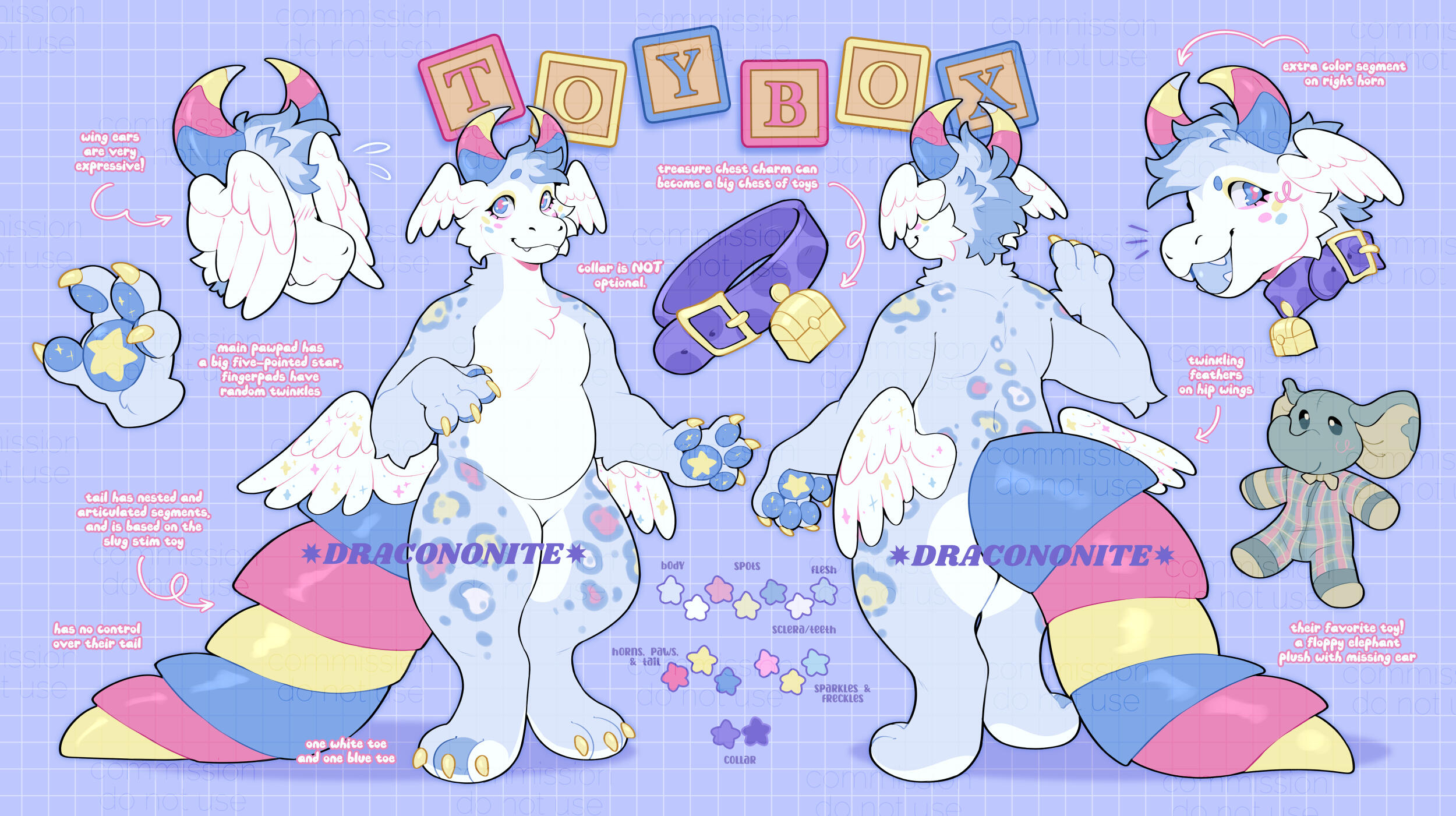 All commissioned artwork must be credited to me in some way that is visible near the artwork being used, such as the inclusion of my username ‘Dracononite.’ Credit for personal use is appreciated as a username plug on social medias or artist’s credits on Toyhouse. Credit for commissioned artwork must include a username plug and a link back to my website, [dracononite.art].
