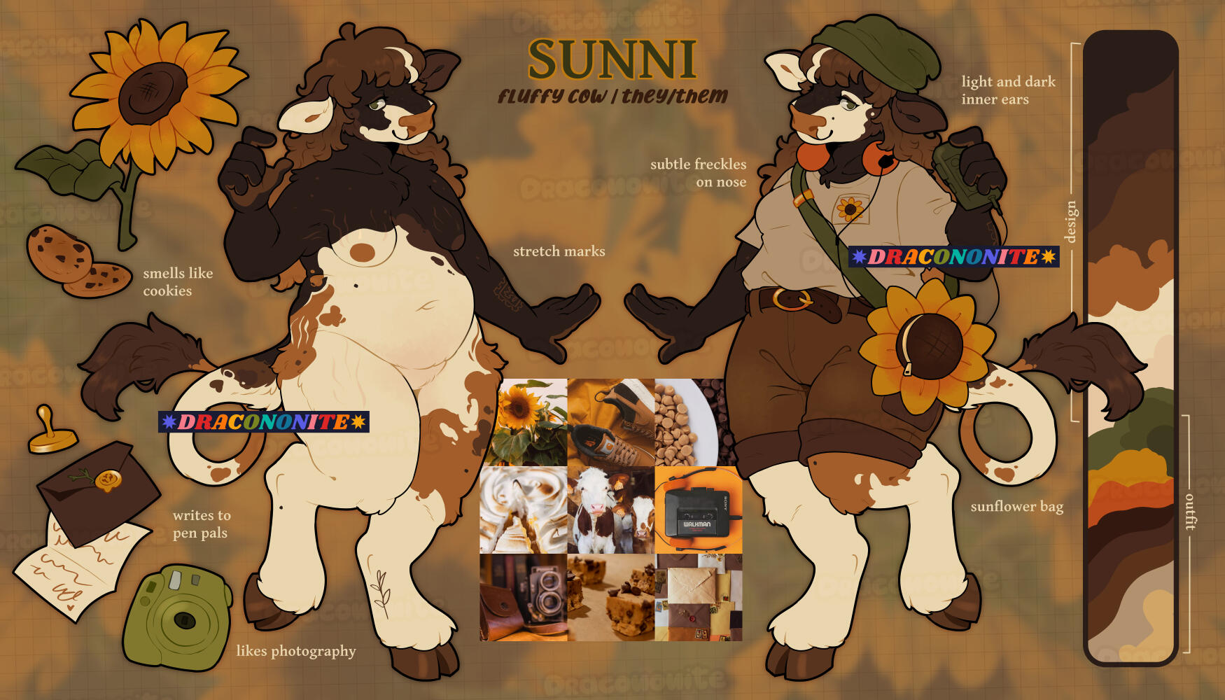 Subjects and characters: draconics/dragons especially wyverns, fantasy humanoids, sphinxes, dragontaurs and centaurs, aquatic mammals, orcas, seals, beetles and dragonflies, Pokemon and Digimon, airplane dragons and aeromorphsMotifs and details: sunflowers, clover, stars, rainbows, food, coffee, the ocean/coast and pine trees, unique noses, claws/horns/tusksColors: warm colors like rich browns, yellow- and mossy greens, warm teals, retro rainbows, dark vivid blues, blue-ish lavenders